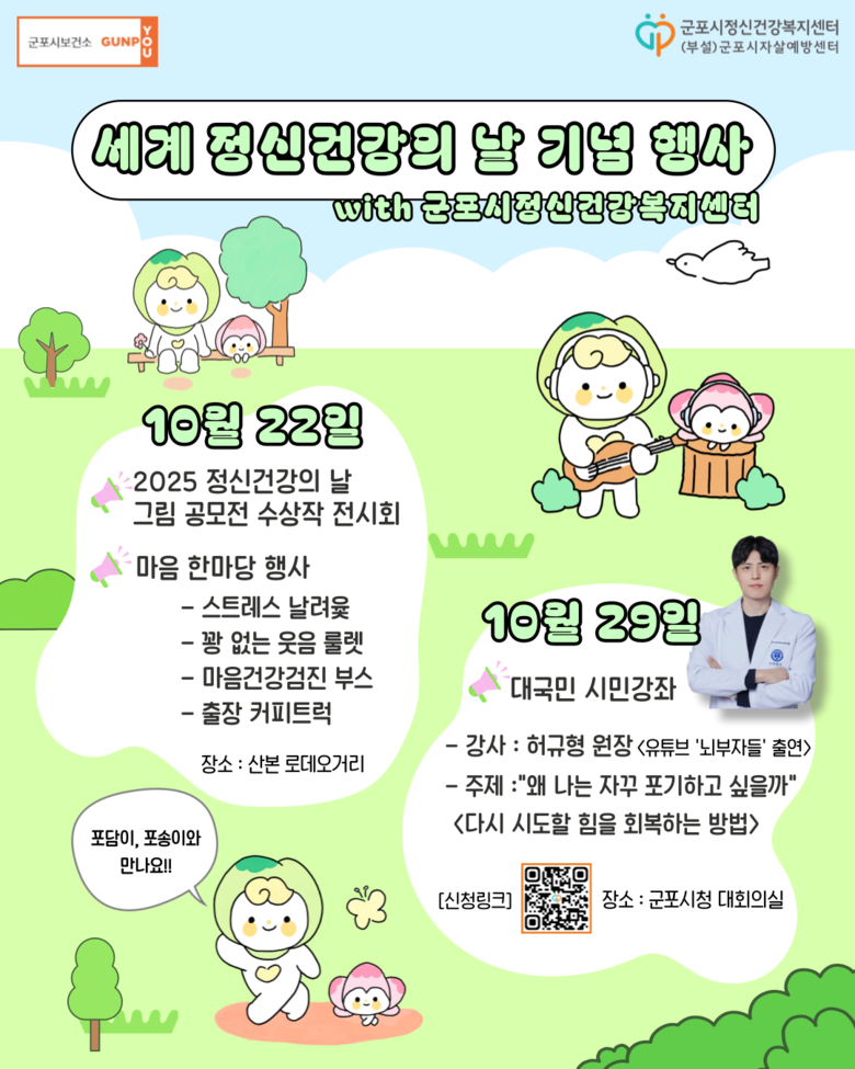 10월 22일(수)에는 산본로데오거리(이마트 앞 상설무대)에서 시민참여형 기념행사를 진행할 예정이다. 행사 현장에서는 ▲정신건강 자가검진 ▲정신건강 인식개선 그림 공모전 수상작 전시 ▲체험 부스(‘스트레스날려윷’, ‘꽝 없는 웃음 룰렛’) ▲출장 커피트럭 등 다양한 프로그램이 운영되며, 사전 신청 없이 오전 10시부터 오후 4시까지 현장을 찾은 누구나 참여 가능하다.
