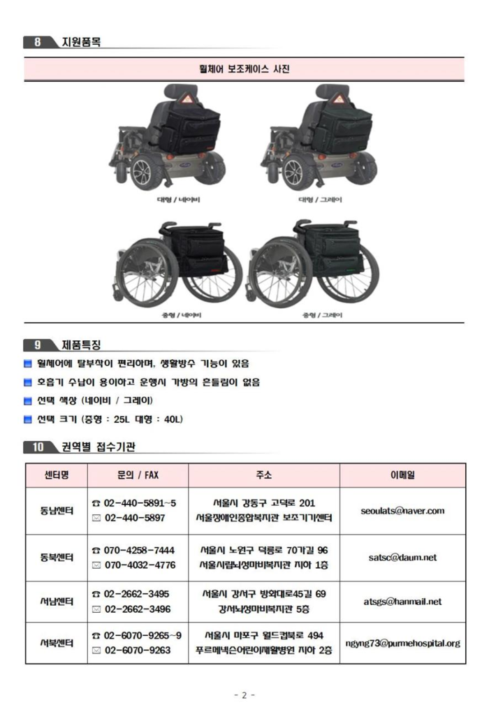 지원 내용은 휠체어 보조케이스를 1인 1품목 지원하며, 보조케이스의 색상(네이비/그레이) 및 크기(25L, 40L)는 선택 가능하다.