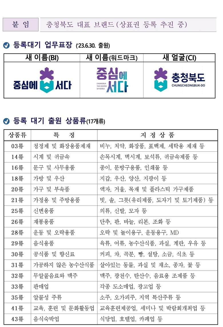 그러나 도형이 병기된 디자인을 등록하여 추진할 경우, 타 지자체에서 ‘중심에 서다’ 용어를 그대로 사용하면서 디자인만 바꿔도 상표로 사용할 수 있어, 충북도는 용어(문구) 자체에 대한 선제적 권리 확보를 위한 적극 행정에 나섰다.