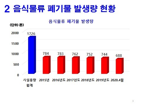 특히, 공공시설인 수영시설은 시설용량 120톤 처리규모를 가지고 있지만 2020년 3월까지 약83톤 처리하고 있으며, 생곡시설은 200톤 규모에 약 73톤 처리에 불가하여 대부분 공공시설과 민간시설에서 시설용량 규모 절반에도 미치지 못하는 실정이다.