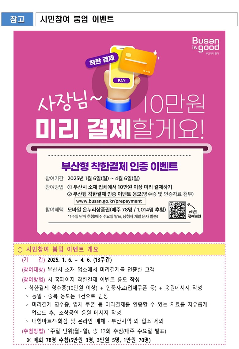 1월 6일부터 4월 6일까지 13주간 진행되는 ‘착한결제 인증 이벤트’는 부산시 소재 업소에서 10만 원 이상 미리 결제한 고객을 대상으로 한다. 참여를 원하는 시민은 시 누리집(www.busan.go.kr/prepayment)에 미리 결제 영수증과 업체 쿠폰 등 인증자료를 게시하고, 소상공인을 응원하는 메시지를 작성하면 된다.