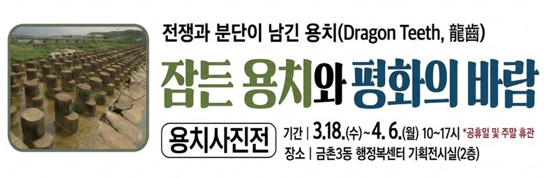 이번 사진전은 경기문화재단과 협력하여 파주를 비롯한 경기도 내 지역 곳곳에 남아 있는 용치(龍齒)를 사진으로 기록하고 그 역사적 의미와 풍경적 가치를 시민들과 공유하기 위해 마련됐다. ‘용치(Dragon Teeth, 龍齒)’는 ‘용의 이빨처럼 보인다’라고 해서 붙여진 이름으로 적군이 침입하기 쉬운 하천이나 교통로에 설치한 콘크리트 구조물이다.