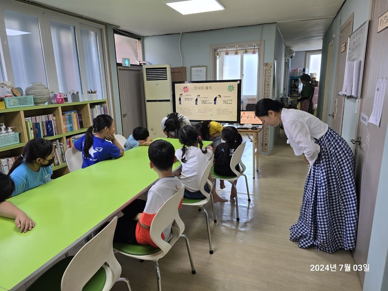| ▲ 지난해 동암지역아동센터에서 진행한 '청소년 전통예절교실'에서 전통예절과 바른 인사법 교육 |