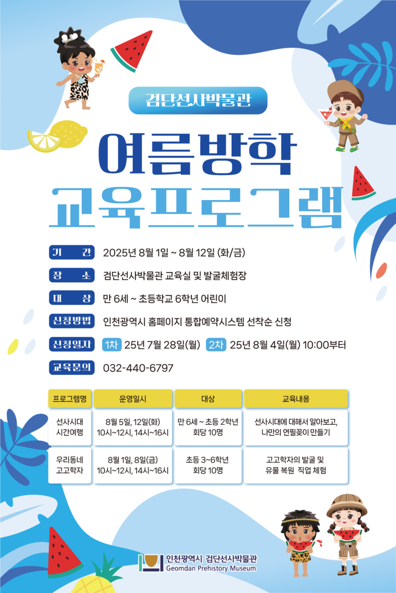 이번 여름방학 교육은 6세부터 초등학교 6학년까지 무료로 참여할 수 있으며, ‘선사시대 시간여행’은 화요일, ‘우리동네 고고학자’는 금요일에 각각 오전과 오후 2회차로 운영된다.