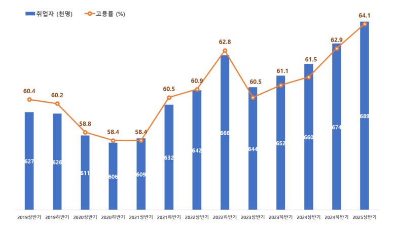 | ▲ 2019년 상반기~2025년 상반기 수원시 고용률 추이. |