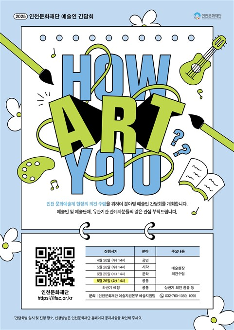 예술인 간담회 < HOW ART YOU? >는 2024년부터 시작하였으며, 분야별 예술인의 의견을 듣고 예술 현장의 현안을 논의하는 소통 창구로 자리매김했다. 특히 작년 간담회에서 제시되었던 ▲지원사업 신청서류 간소화 ▲지원신청 인천 연고 기준 개편 ▲선정 지원사업 홍보 확대 등 의견을 2025년 인천문화재단 예술창작지원사업 공모에 반영하여 현장의 의견이 정책으로 환류되는 선순환 구조를 만들었다.