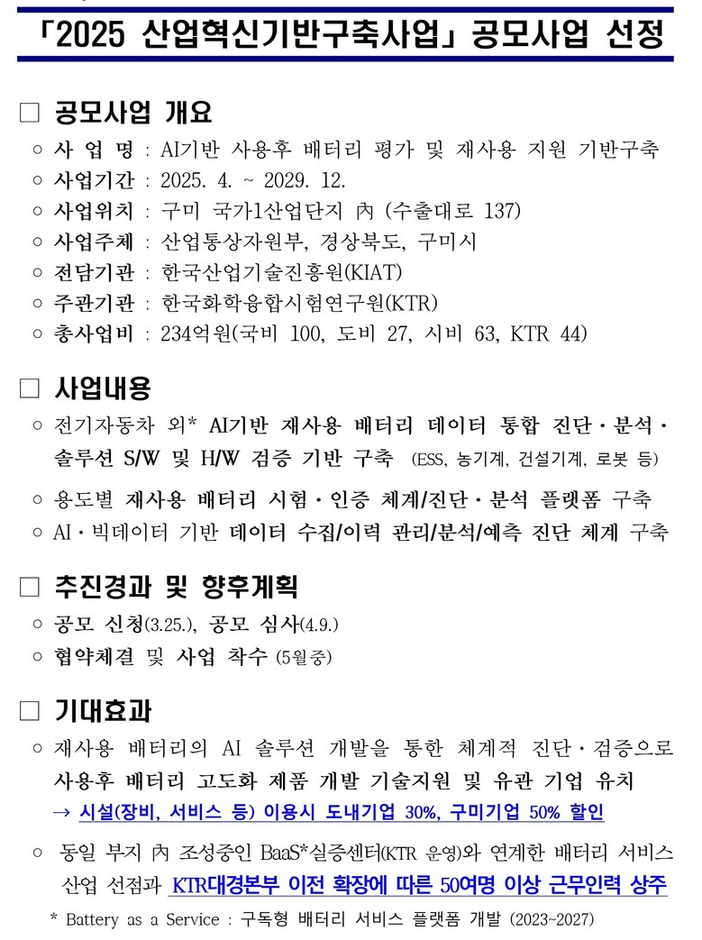 총 사업비는 234억원(국비 100억원, 지방비 90억원, 민간 44억원)이 투입되며, 2029년까지 5년간 사업이 추진된다. 사업의 핵심 인프라인 AI기반 재사용 배터리 통합지원센터는 구미국가1산업단지에 조성되며, 운영은 본 사업의 주관기관이자 국가공인 시험. 연구기관인 한국화학융합시험연구원이 맡는다.