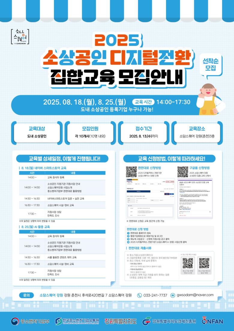 소상공인 디지털전환 집합교육은 8월 18일(월)과 25일(월) 오후 2시, 「소담스퀘어 in 강원」 글로벌스튜디오(춘천)에서 진행된다. 이번 교육은 <스마트스토어 입점>, 주제로 각각 진행되며, 이후 9월~11월까지도 다양한 디지털 전환 주제로 전문교육을 이어갈 예정이다.