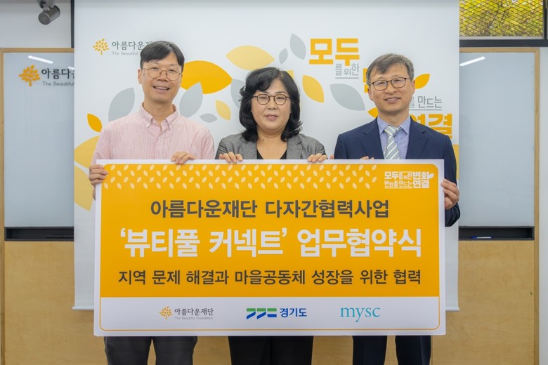 지난달 30일 서울 종로구 아름다운재단에서 열린 협약식에는 공정식 경기도 사회혁신경제국장, 김진아 아름다운재단 사무총장, 김정태 MYSC 대표가 참석했다.