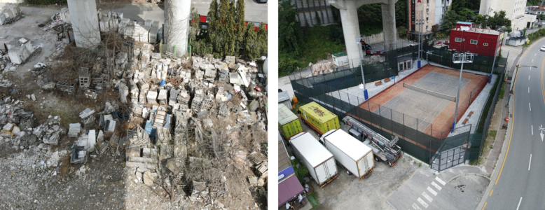 | ▲ 용인특례시 기흥구가 신갈동 537-85번지 고가도로 하부를 시민편의시설로 조성한 모습. 사진은 조성 전(왼쪽)과 조성 후(오른쪽) |
