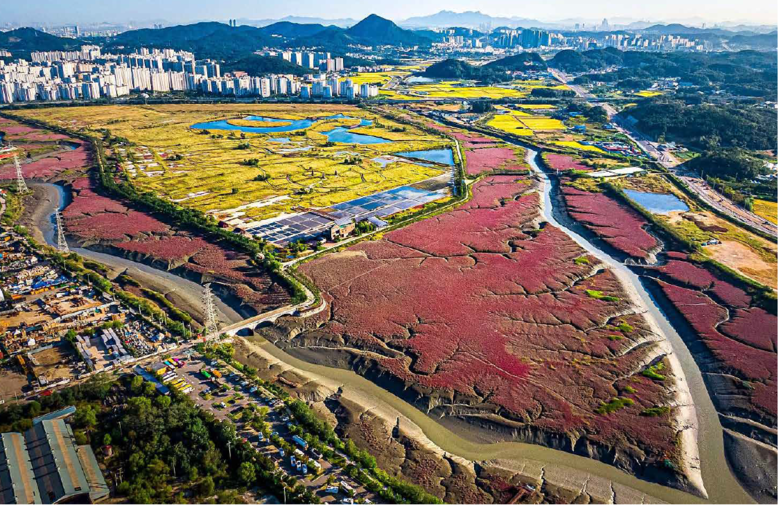 또한 8천년 세월이 빚어낸 사행성 급경사 갯골*은 전국 어디에서도 보기 힘든 지형적 특성을 가지며, 가을철 붉은 카펫처럼 펼쳐지는 해홍나물, 나문재, 칠면초등의 염생식물 군락은 그 자체로 천연기념물급 경관을 자랑한다.
