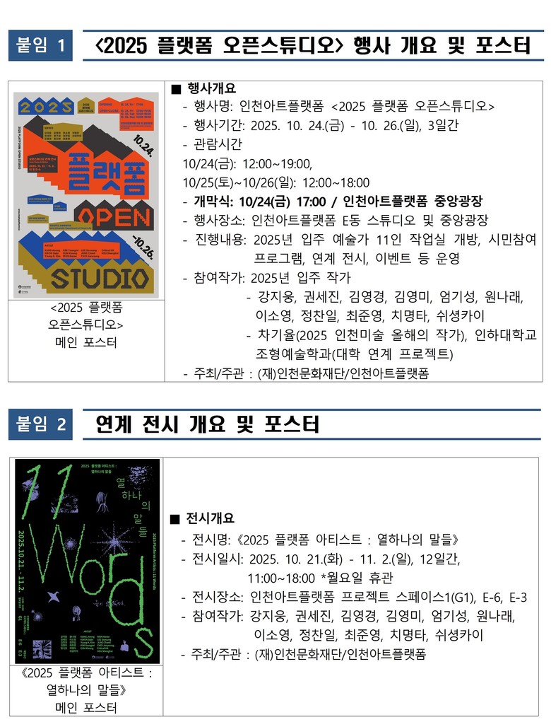 한편, 입주작가 11인이 모두 참여한 오픈스튜디오 연계 전시 《2025 플랫폼 아티스트 : 열하나의 말들》이 10월 21일부터 11월 2일까지 인천아트플랫폼 G1과 E-6, E-3(체험공간)에서 개최된다. 이번 전시는 회화, 조각, 사진, 영상, 설치 등 다양한 장르의 작품들과 함께, 작가들이 전하는 ‘열하나의 말들’이 전시장에 설치된다. 관람객들은 전시를 관람하고 마음에 떠오르는 말들을 수집하여, 전시에 관한 서로의 생각과 감상을 짧은 글로 적어 나눠볼 수 있다.