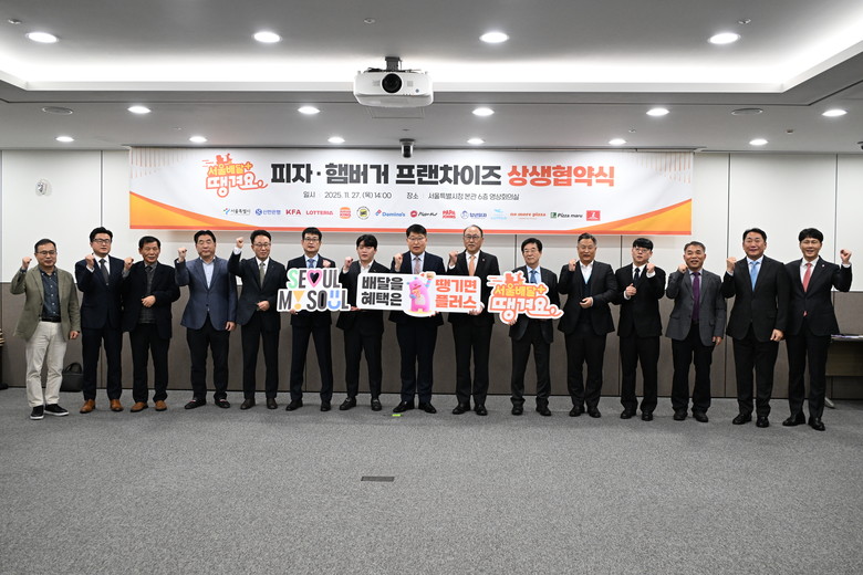 시는 11월 27일(목) 오후 2시, 서울시청 영상회의실에서 신한은행(은행장 정상혁), 한국프랜차이즈산업협회(회장 정현식) 및 피자‧햄버거 분야 11개 대표 프랜차이즈 본사와 함께 「서울배달+ 땡겨요 활성화를 위한 피자‧햄버거 프랜차이즈 상생 협약」을 체결했다.