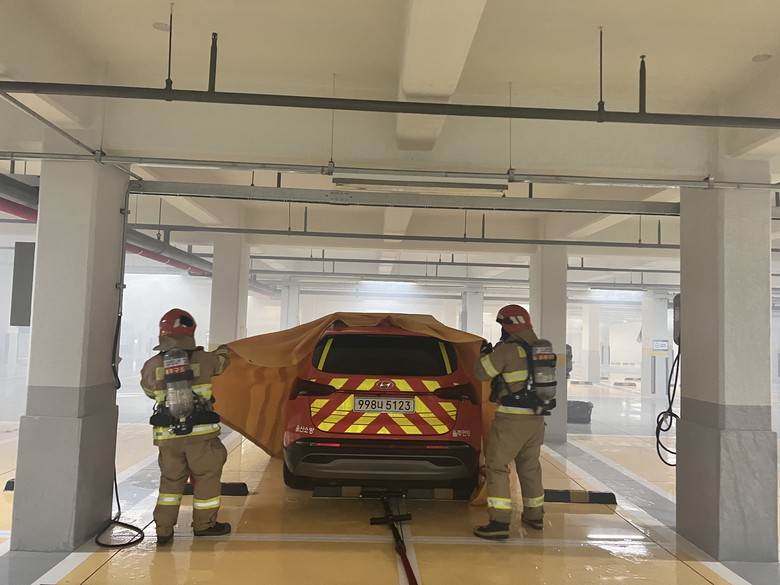 훈련내용은 ▲불이 난 차량을 덮어 산소를 차단하는 질식소화포 훈련▲전기차량 화재 주원인인 배터리를 중점으로 화재 진압하는 하부 주수식 관창 훈련 ▲차량 주변을 물로 냉각하는 방식의 휴대용(포켓식) 소화수조 등이다.