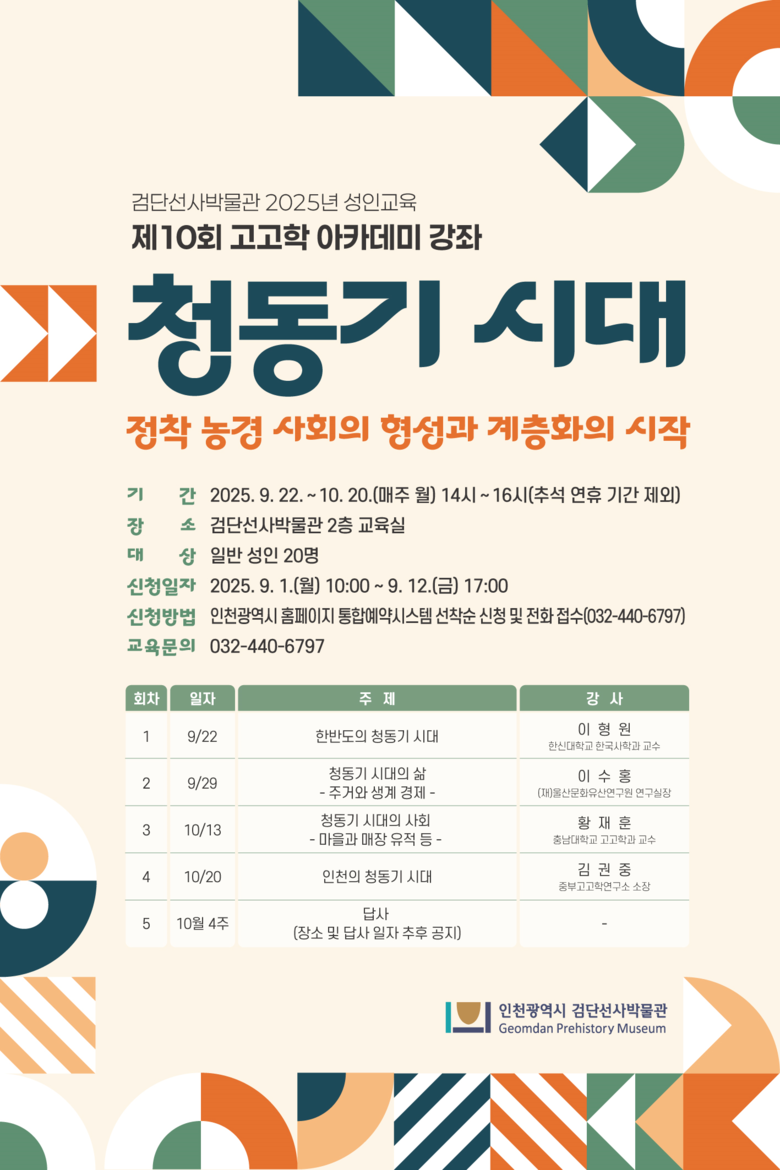 강의는 총 5회로 구성되며, 이 중 1회는 현지답사로 진행돼 참여자들이 직접 유적 현장을 체험할 수 있다. 주요 강의 주제로는 한반도와 인천의 청동기 시대, 당시 유물과 유적을 통해 알아보는 청동기 시대의 삶 등이다.