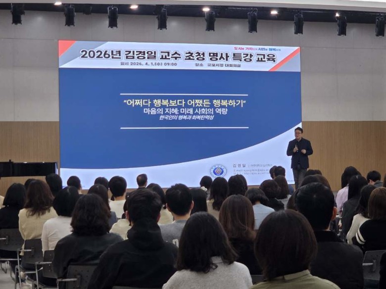 이번 특강은 바쁜 행정 현장에서 시민을 위해 헌신하는 공직자들이 삶의 질과 행복의 의미를 되돌아보고 조직 내 긍정적 에너지를 확산하기 위해 마련됐으며, 시청 공직자 등 300여 명이 참석해 큰 호응을 얻었다.