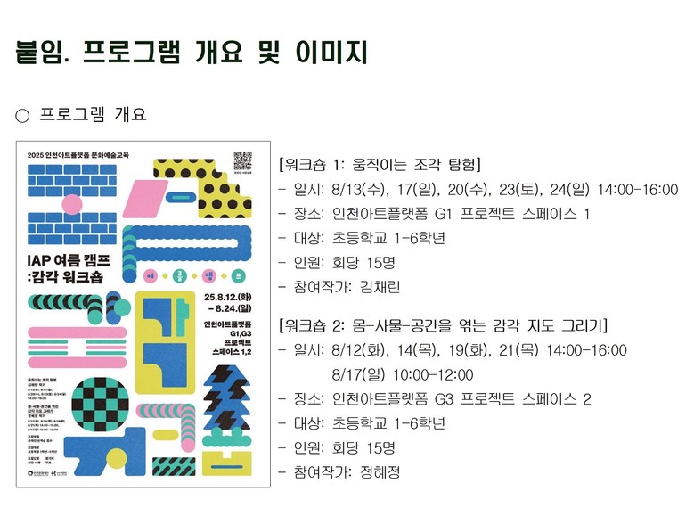 워크숍 결과물은 9월 11일부터 27일까지 인천아트플랫폼 G1동과 G3동에서 전시되며, 결과물 중심의 전시를 넘어 창작 과정 자체를 포함하는 ‘참여형 전시’로 구성되어 관람객과의 상호작용을 통해 완성도를 더할 예정이다.