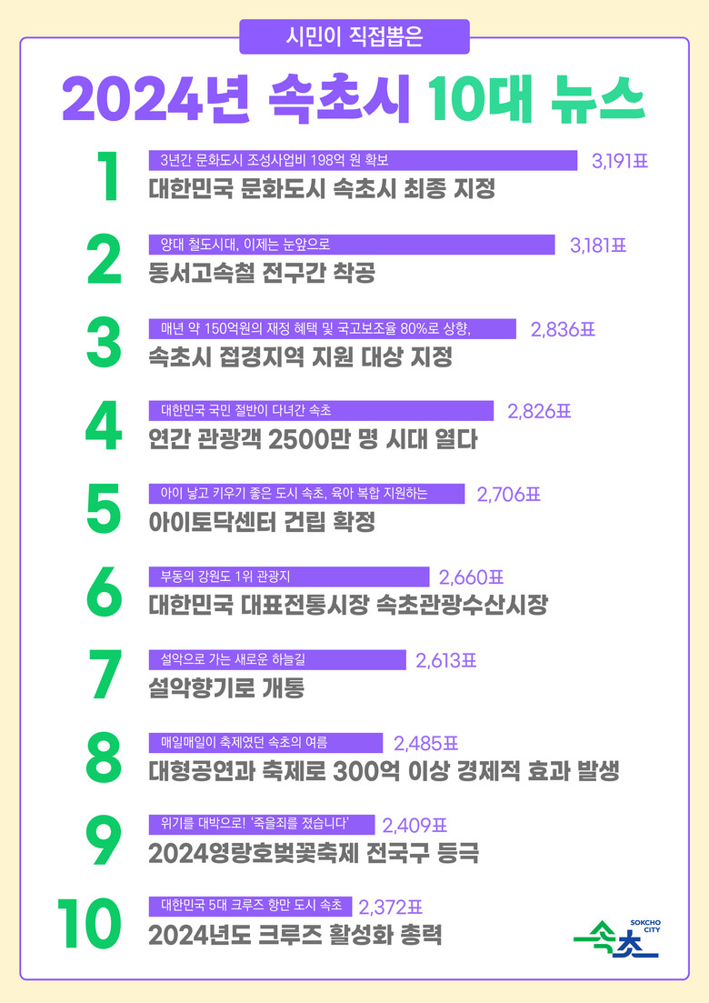 이외에도 △6위 ‘부동의 강원도 1위 관광지, 대한민국 대표전통시장 속초관광수산시장’ (2,660표) △7위 ‘설악으로 가는 새로운 하늘길, 설악향기로 개통’ (2,613표) △8위 ‘매일매일이 축제였던 속초의 여름, 대형공연과 축제로 300억 이상 경제적 효과 발생’ (2,485표) △9위‘위기를 대박으로! 죽을죄를 졌습니다, 2024영랑호벚꽃축제 전국구 등극’ (2,409포) △10위‘대한민국 5대 크루즈 항만 도시 속초, 2024년도 크루즈 활성화 총력’ (2,372표) 등이 2024년 속초시 10대 뉴스로 선정되었다.