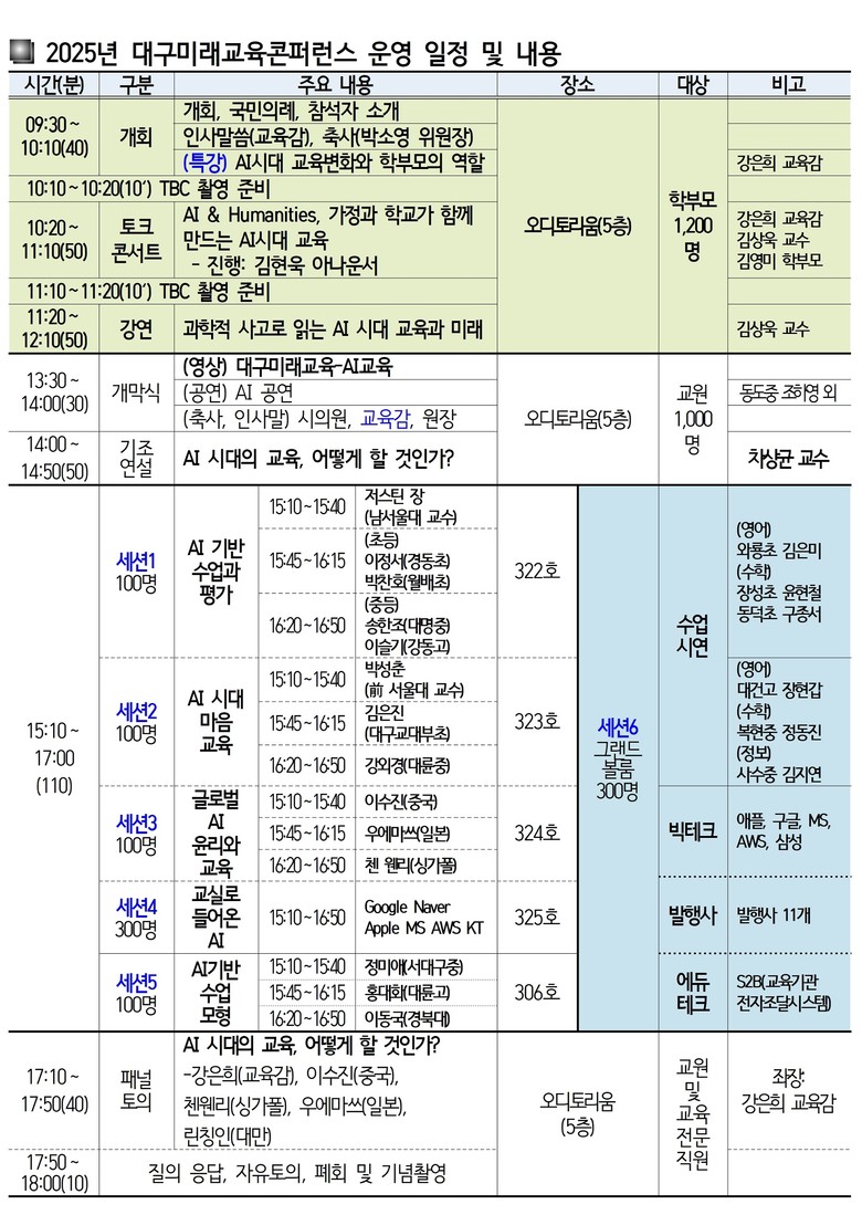 ‘AI 기반 수업과 평가’ 세션에서는 저스틴 장 남서울대 교수를 비롯해 대구 초·중등 교사들이 AI 기반 수업 사례를 발표하고, ‘글로벌 AI 윤리와 교육’ 세션에서는 중국·일본·싱가포르 전문가가 각국의 AI 교육 정책을 소개한다. ‘교실로 들어온 AI’ 세션에서는 Google, Apple, Microsoft, AWS, KT 등 빅테크 기업이 AI 교육 솔루션을 발표하며, 그랜드볼룸에서는 초·중·고 교사의 영어·수학·정보 교과 수업 시연이 이루어진다.
