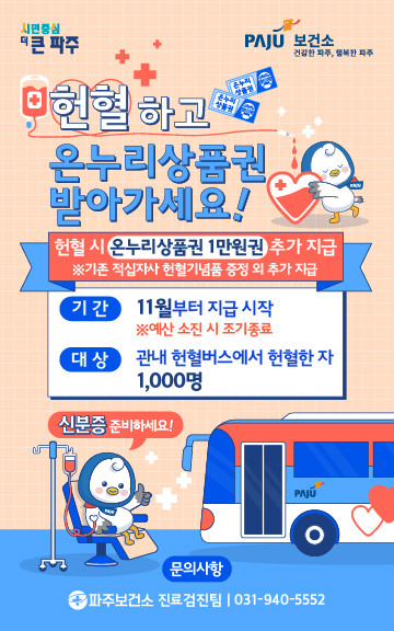 한편, 이번 헌혈장려금 지원 대상은 총 1,000명으로, 예산 소진 시 상품권 지급이 조기 종료될 수 있다. 자세한 내용은 파주보건소 진료검진팀(☎031-940-5552)으로 문의하면 된다.