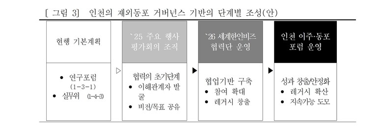 연구는 이를 위한 구체적 실행 방안으로, 2025년 인천에서 개최된 세계한인차세대대회(5.27~30) 및 세계한인경제인대회에 대한 평가를 통해 민・관・산・학 협력 기반을 조성하고, 평가회의 성과를 바탕으로 2026년 대회 지원을 위한‘민관산학협력단’을 운영할 것을 제안했다. 또한, 대회 이후에는 이 협력단을‘인천 이주・동포 포럼’으로 전환하여 인천시 재외동포 시정을 지속적으로 뒷받침하는 거버넌스 기반으로 제도화해 나갈 필요가 있다고 밝혔다.