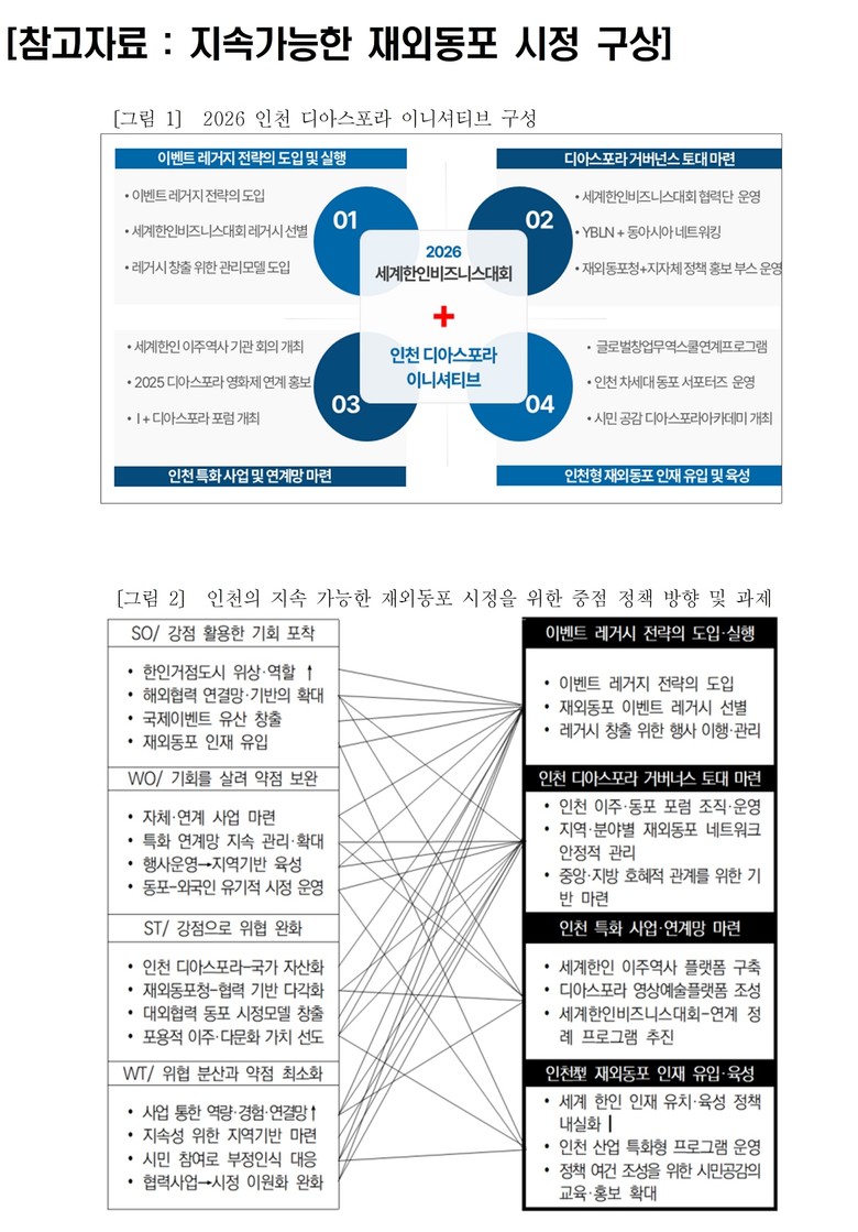 특히 이번 연구는 2026년 인천에서 개최 예정인 세계한인비즈니스대회를 중심으로, 위의 네 가지 전략을 종합적으로 실행하는 정책 프레임워크로서 ‘인천 디아스포라 이니셔티브(Incheon Diaspora Initiative, IDI)’의 추진을 제안하였다.