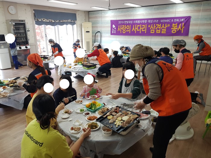 [세종=세계타임즈 이채봉 기자] 9천명 SNS 대전시 봉사단체 사랑의 사다리 밴드(리더 이정제)는 지난14일 오전11시, 서구 정림동 아동보육시설 후생학원(원장 김영화)에서 삼겹살 봉사로 우리 사회의 따뜻한 사랑을 전달 하였다.