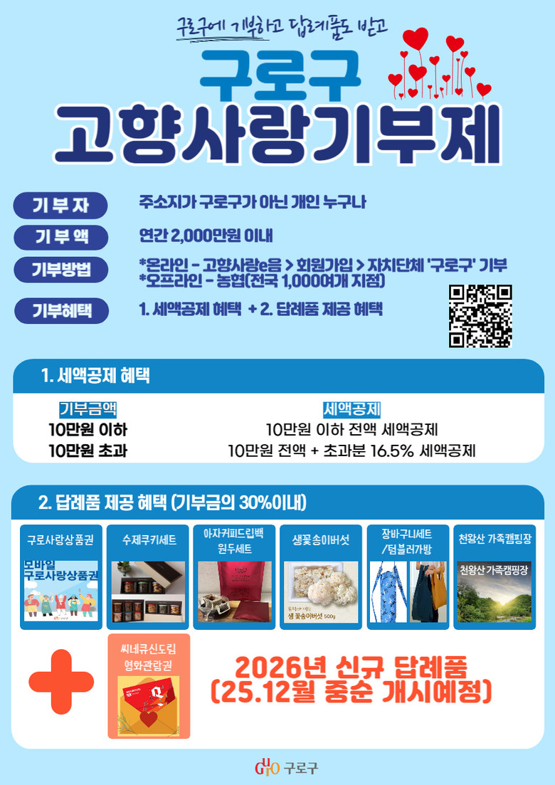 기부금은 연간 2천만원 한도 내에서 가능하며, 10만원까지는 전액(100%), 10만원 초과분은 16.5%의 세액공제 혜택을 받을 수 있으며, 기부 금액의 30% 상당의 구로구 답례품도 제공된다.