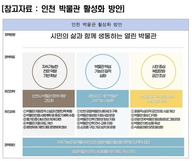 이와 같은 인천시 박물관 정책의 이슈와 박물관 기능 및 역할에 관한 국내외 담론을 검토한 결과를 종합하여 ‘시민의 삶과 함께 생동하는 열린 박물관’을 정책 비전으로 설정하고, ▲지속가능한 전문역량 기반 확보, ▲박물관 핵심 기능의 질적 심화, ▲시민 중심 복합문화공간 조성 등을 3대 목표로 제안하였다.