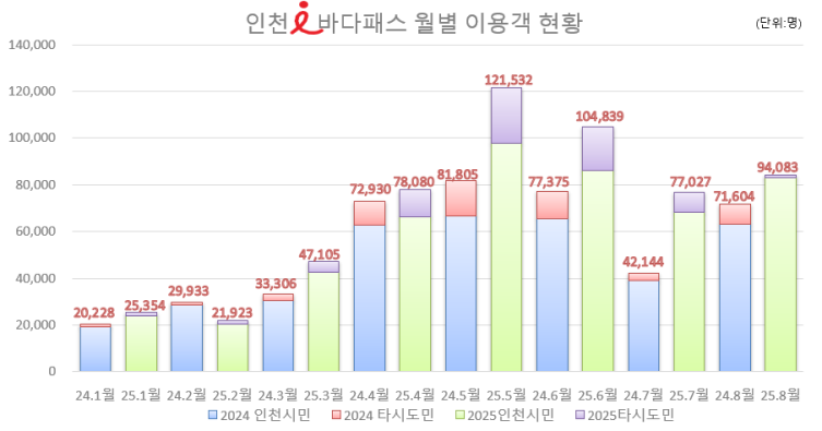 인천시에 따르면 지난 8월 i-바다패스 누계 이용건은 총 56만9,943건으로 지난해 42만9,325건에서 33% 증가했다. 특히, 7월 한달간 성장률은 83%로 i-바다패스 도입 후 가장 높았다.