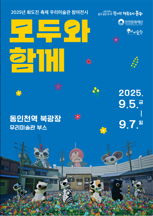 인천 동구 주민들의 전시 관람과 문화 향유의 기회를 확대하고자 우리미술관이 마련한 이번 <모두와 함께> 전시에서는, 우리미술관이 위치한 만석동을 배경으로 한 조세민 작가의 관람자 참여형 미디어아트(Interactive Art)를 만날 수 있다. 관람자의 동작에 맞추어 반응하는 귀여운 캐릭터들과 음악에 맞춰 춤을 출 수 있는 미디어 작품으로, 화도진 축제 방문객들이 작품을 관람하고 체험할 수 있도록 축제 부스에 전시를 마련했다.