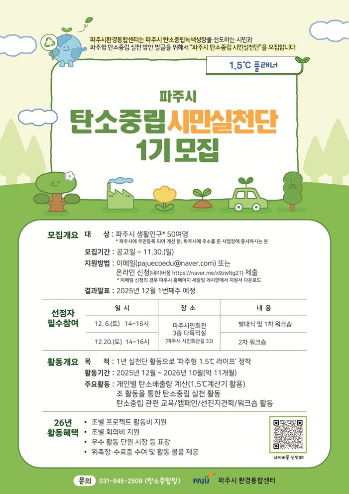 이번 시민실천단 모집 인원은 파주시 생활인구 50명이며, 오는 11월 30일까지 전자우편(pajuecoedu@naver.com) 또는 홍보물 정보 무늬(QR코드)를 통해 접속 가능한 ‘네이버 폼’으로 신청할 수 있다. 신청서 양식은 파주시청 누리집 ‘새소식’ 게시판에서 내려받을 수 있다.