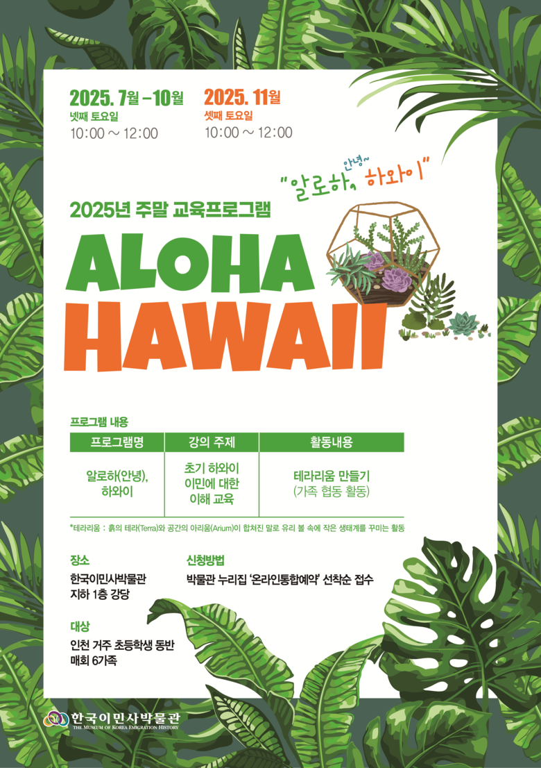 한국이민사박물관 관계자는 “‘알로하(안녕), 하와이’ 주말 교육프로그램을 통해 참가 시민들이 우리나라 최초의 공식 이민지인 하와이의 이민 역사를 이해하고, 가족과 함께하는 테라리움 활동을 통해 흙과 식물의 감촉을 느끼며 치유의 시간을 갖길 바란다”고 말했다.