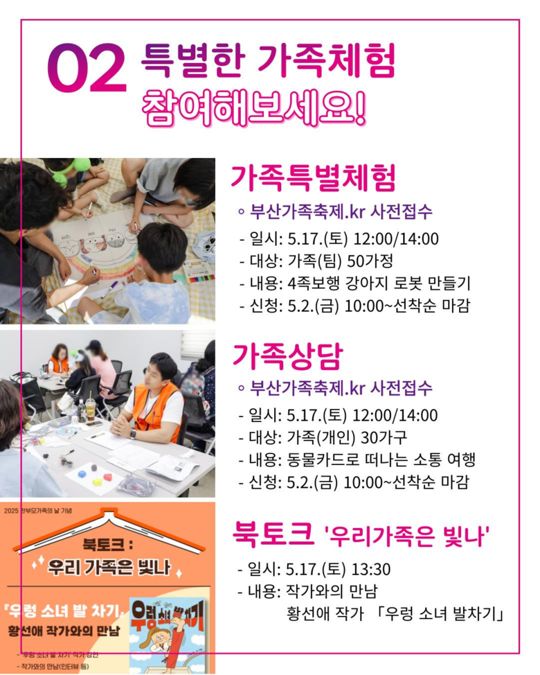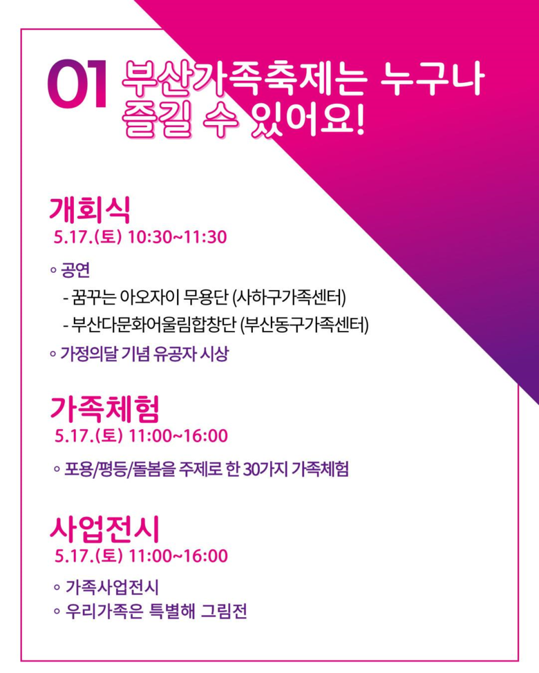 또한, ▲부산가족축제 홍보물을 공유하는 ‘재잘재잘 소문내기 이벤트(~5.16.)’ ▲가족의 특별한 순간을 나누는 ‘우리가족이 빛나는 순간’ ▲가족의 소중한 가치를 발견하는 ‘우리가족의 빛나는 가치’ 이벤트도 진행된다.