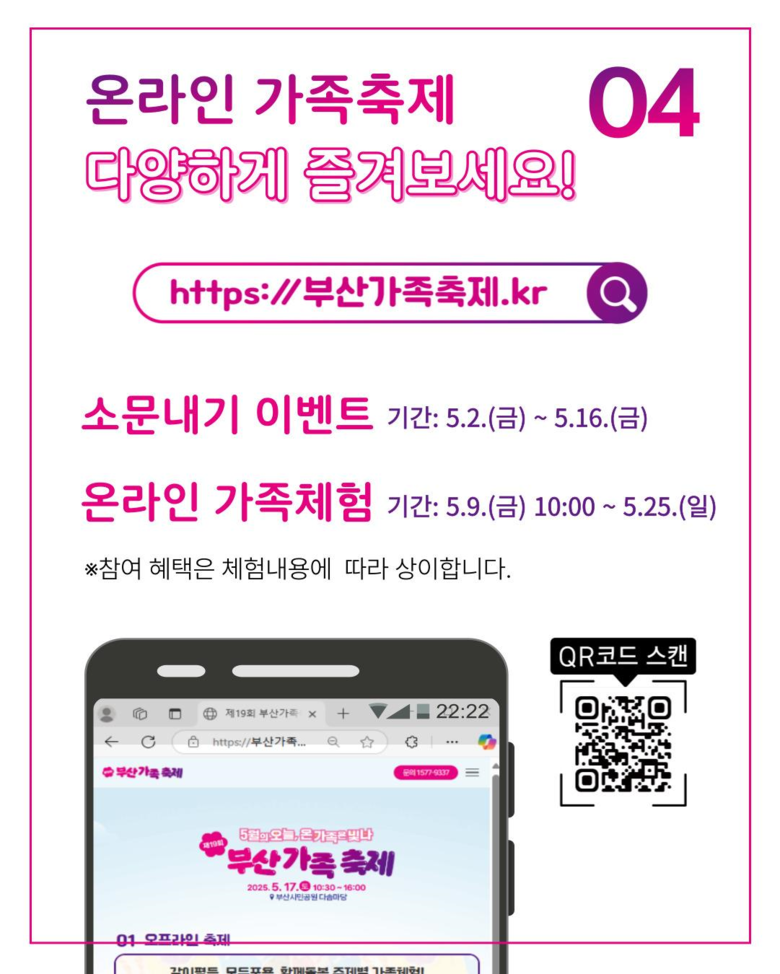 부산시민공원에서뿐만 아니라, 5월 25일까지 부산가족축제 공식 누리집(부산가족축제.kr)을 통해 온라인으로도 축제를 즐길 수 있다.