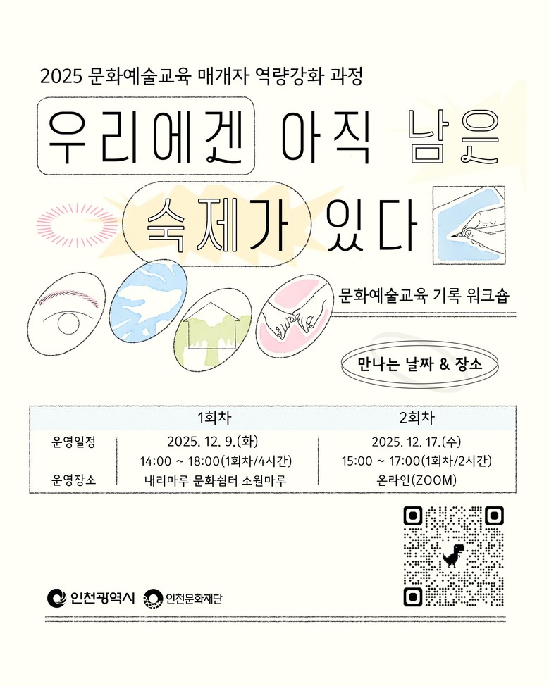 이어지는 워크숍 <우리에겐 아직 남은 숙제가 있다>는 12월 9일과 17일, 두 차례에 걸쳐 오프라인(내리마루 문화쉼터)과 온라인으로 진행된다. 본 워크숍은 문화예술교육 지원사업 참여 경험이 있거나 개인 블로그, 인스타그램, 노션 등 온라인 기록 채널을 운영하는 예술교육가를 대상으로 하며, 한 해의 활동을 되돌아보고 개인의 경험과 시선을 언어적·시각적으로 구조화하는 방법을 다룬다. 예술교육 활동에서 기록은 다음 활동을 기획하는 중요한 기반이지만, 바쁜 일정 속에서 꾸준히 기록을 축적하기 어렵다는 현실을 고려해 실제 파일 정리, 기록 구조 설계, 개별 피드백 등 실질적인 도움이 되는 실습으로 구성했다. 워크숍은 문화예술기획자 최선영(복많관 대표)이 주강사로, 시각예술가 이려진, 구은정이 보조강사로 참여한다.