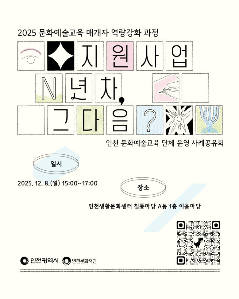 12월 8일 인천생활문화센터 칠통마당에서 진행되는 사례공유회 <지원사업 N년차, 그다음?>에서는 ‘모씨네 사회적협동조합’과 ‘좋은음악 소리랑’이 지역에서 문화예술교육 단체로 활동하며 쌓아온 운영 경험을 공유한다. 재단 지원사업을 단체 성장을 위한 발판으로 활용하는 방법을 비롯해 자체 콘텐츠 개발, 지역사회 연계, 수익화 전략까지 다양한 현장 사례를 소개할 예정이다. 발표는 전철원 모씨네 사회적협동조합 이사장과 김미선 좋은음악 소리랑 대표가 맡는다. 두 발표자는 단체 설립부터 성장·운영 과정에서 얻은 실제 경험을 바탕으로, 지속가능한 문화예술교육 단체의 운영 방향을 함께 제시할 예정이다.