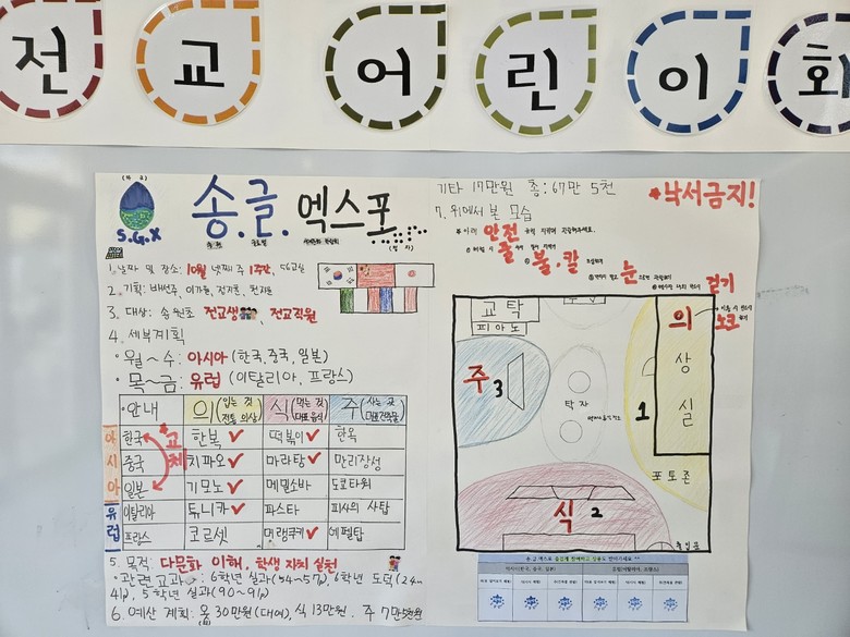 ‘송글 엑스포’는 전교학생회가 5월, 9월 두 차례의 학생 회의를 거쳐 기획한 학생제안사업으로, ‘송원 글로벌 문화 박람회’의 줄임말이자 학생들이 직접 땀 흘려 만들어 가는 행사라는 의미이며, 교실을 세계 문화 박람회장으로 꾸며 다양한 체험을 할 수 있도록 구성하였다.
