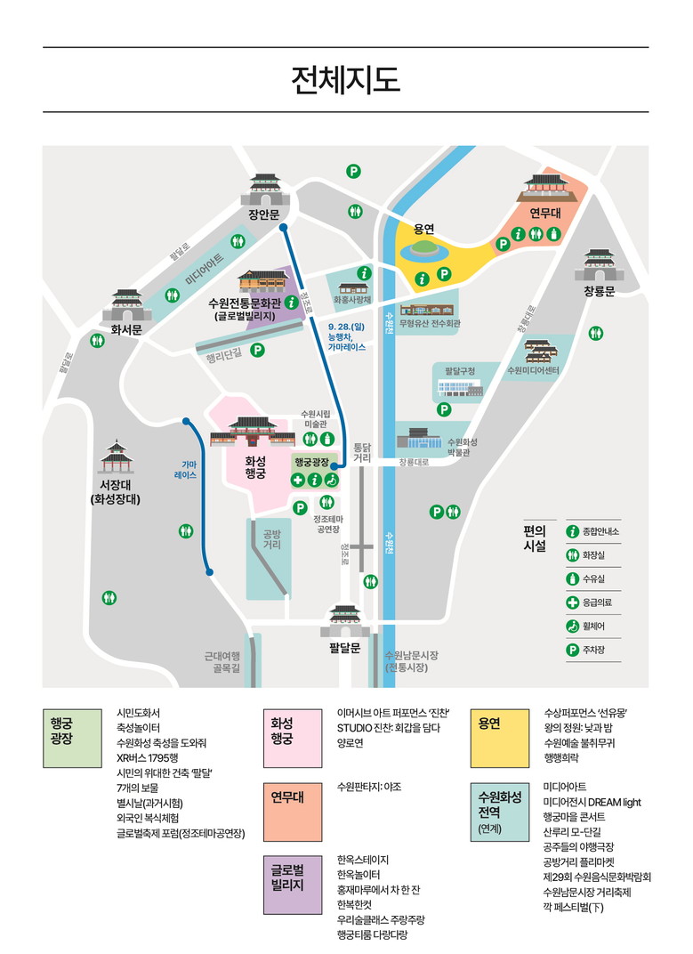 수원화성문화제 8일 동안 성안 행궁동 일대는 거리마다 축제의 즐거움이 가득 담길 예정이다. 메인 프로그램 외에 포럼, 전시, 연계 행사 등 다채로운 즐길거리가 관광객을 기다린다.