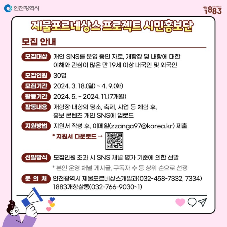 시민홍보단은 개항장과 내항에 관심 있고 개인 SNS 계정을 활발히 운영 중인 만 19세 이상의 내·외국인 누구나 신청할 수 있으며, 시민홍보단 발대식 및 시 행사·축제 등에 참여할 수 있다.