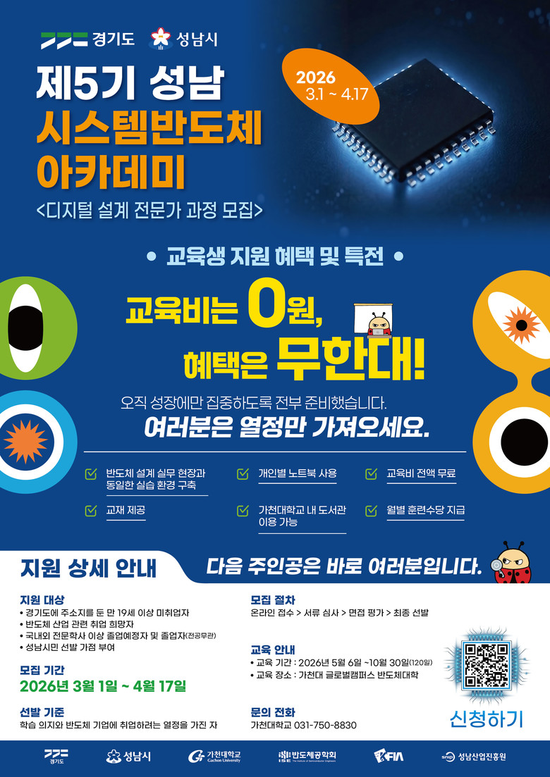 가천대학교는 시스템반도체 설계 입문과정 교육생 30명을 4월 17일까지 모집하며, 교육기간은 5월부터 10월까지 6개월이다. 모집 대상은 경기도 거주 19세 이상 전문학사 이상 졸업(예정)자다.