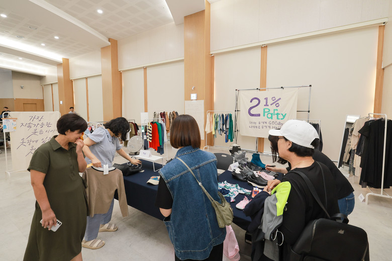 특히 이날 사람들의 시선을 끈 건 단연, 부대 행사로 진행된「21% 파티」였다. 이 행사는 ‘사놓고 입지 않는 옷의 평균 비율이 21%에 달한다’는 ‘다시입다연구소’의 조사 결과에 착안한 행사로, 입지 않는 옷을 가져와 서로 교환하여 새로운 옷을 얻는 색다른 의류소비 방식이다. 오전 10시부터 오후 5시까지 진행된 「21% 파티」에는 마을공동체 활동가 뿐 아니라 시민과 군포시 공직자들이 함께 참여하여 의미를 더 했으며 일상의 작은 실천이 사회적 가치 나눔으로 이어질 수 있음을 잘 보여주었다.