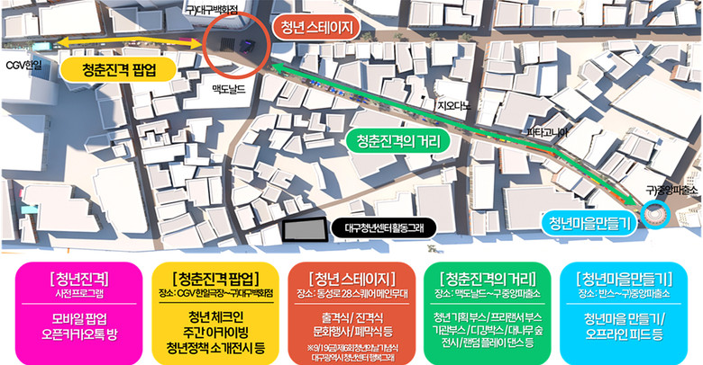 또 18일(토)에는 음악·공간·창업 분야의 청년 활동가가 참여하는 ‘청년토크쇼’가 열리고, 19(일)에는 ‘청년 프리랜서 공연’과 ‘청년카니발’이 펼쳐져 동성로를 청춘의 열정으로 물들인다.
