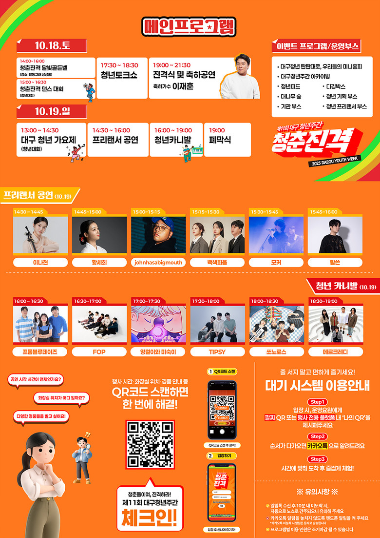 특히, 동성로 메인무대에서는 청년 댄서와 보컬이 실력을 겨루는 ‘스트릿 배틀 & 청춘 싱어즈’가 펼쳐진다. 우승자에게는 상금과 함께 폐막식 오프닝 무대의 기회가 주어진다.