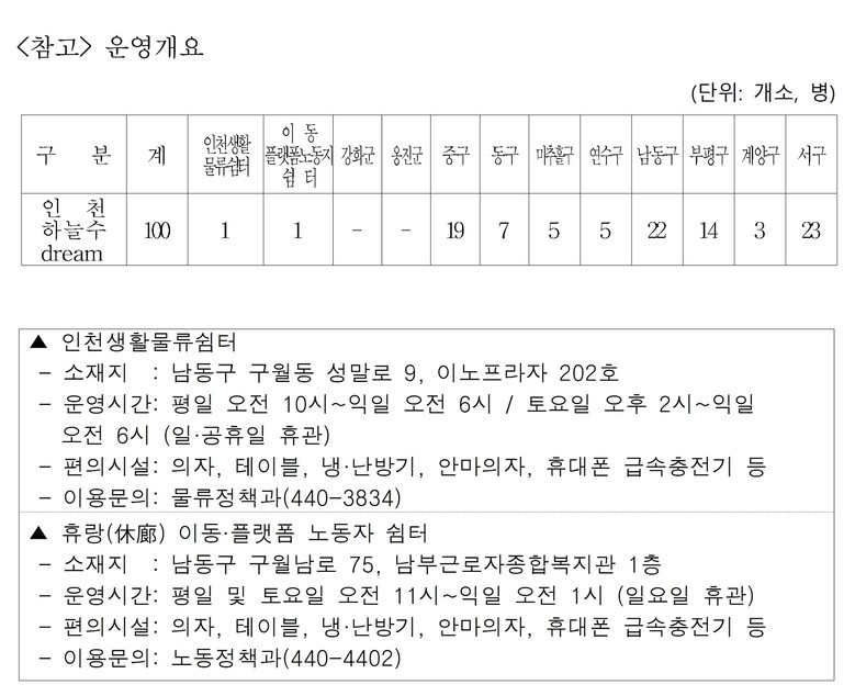 기존 중구, 동구, 미추홀구, 남동구, 서구 5개 구에서만 운영하던 생수냉장고를 연수구, 부평구, 계양구 등 3개 구까지 확대했다. 또한 행정복지센터, 야외 무더위 쉼터, 플랫폼·생활물류노동자 쉼터 등 다양한 장소에 설치되어 총 100개소에서 운영된다.