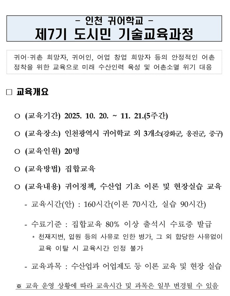 [인천 세계타임즈=심하린 기자] 인천광역시(시장 유정복) 수산기술지원센터는 9월 26일까지 ‘제7기 인천 귀어학교’ 입교 희망자를 모집한다고 밝혔다.