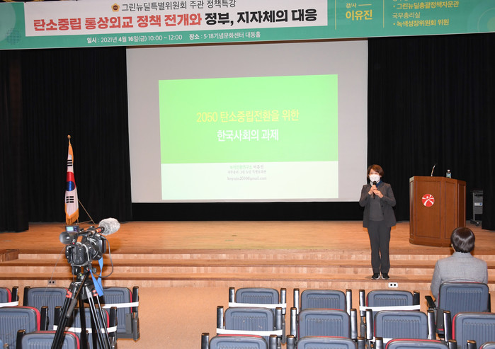 이날 특강에서 이유진 박사는 탄소중립을 위한 각 국가의 정책소개와 정부의 그린뉴딜 5대 대표과제 및 탄소중립 사회혁신 방안, 2050 탄소중립을 위한 추진전략, 탄소중립을 위한 한국사회 및 지방정부의 과제와 대응방안에 대해 참석자들과 내용을 공유했다.
