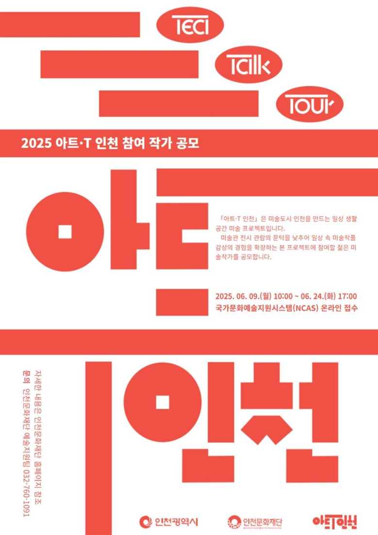 [인천 세계타임즈=심하린 기자] 인천광역시(시장 유정복)와 인천문화재단(대표이사 김영덕)은 2025년 「아트·T 인천」 사업에 참여할 청년 미술작가를 오는 6월 24일(화)까지 공개 모집한다. 이번 공모는 인천에 연고가 있는 청년 미술작가라면 누구나 지원할 수 있다. 선정된 작가에게는 카페, 서점 등 일상 생활공간에서의 전시 기회와 소정의 작가비(Artist fee), 작품 프로모션도 지원된다.