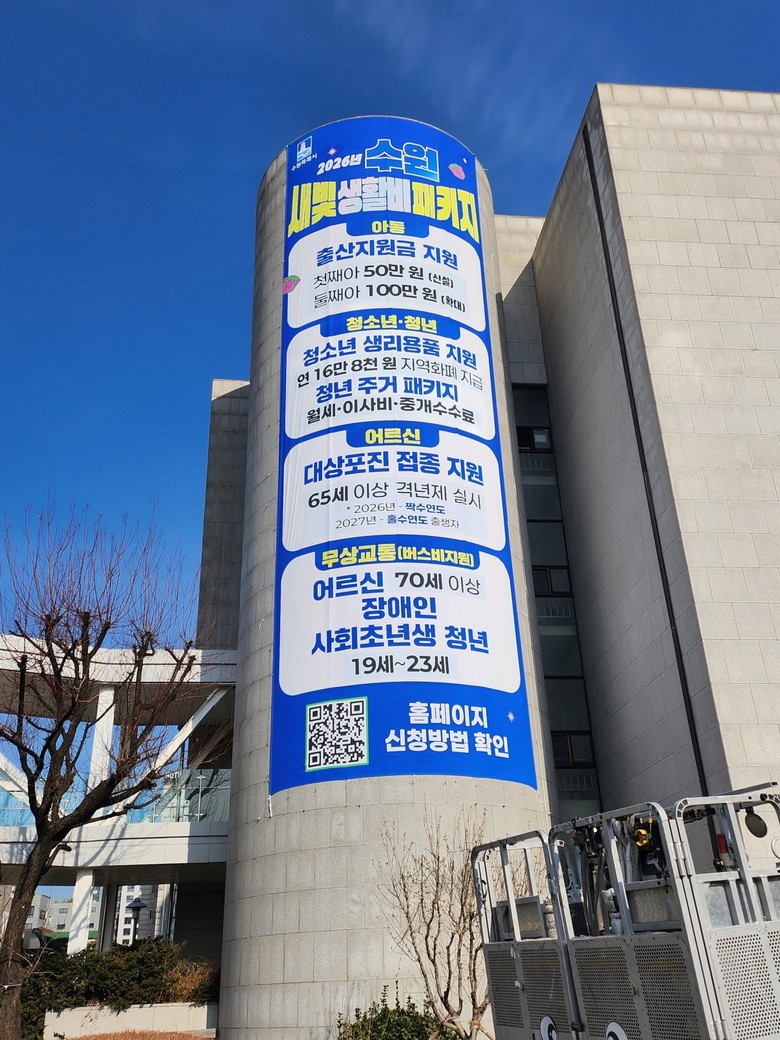 ▲ 수원시청 청사 외벽에 수원시 새빛 생활비 패키지를 알리는 대형 현수막이 게시돼 있다.
