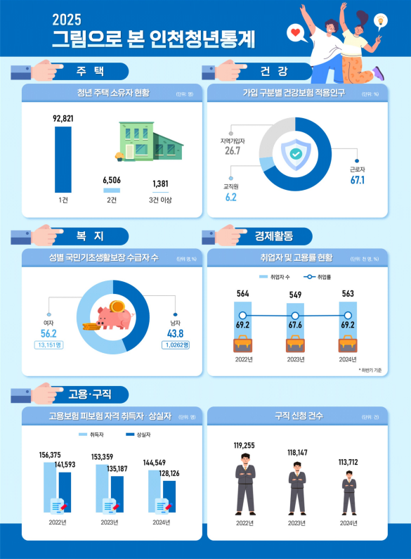 2024년 기준 인천시에 거주하는 18~39세 청년인구는 848,502명으로 전년 대비 0.3%(2,691명) 감소했으며, 전체 인구 대비 청년 비중은 27.7%로 전국 17개 시도 중 높은 수준을 유지하고 있다. 청년 가구는 255,924가구로 전체 일반가구의 20.6%를 차지했으며, 이 중 1인 가구 비중은 47.1%로 가장 높게 나타났다.